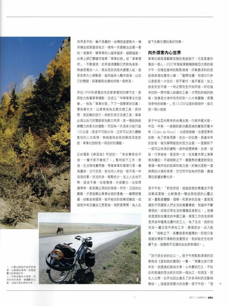 單 車壯遊是個艱難危險的長途旅行,尤其是當你獨自一個人。2007年曾經單騎橫跨歐亞大陸的張子午,回憶起當時的點點滴滴,印象最深刻的是經過某個哈薩克小 鎮:「翻開地圖,前面800多公里都是一片空白,前不著村,後不著店,加上語言完全不通,一時之間完全不知所措。好在後來找到一間中國人經營的工廠,才問 到詳細的路線。就像是大海中忽然抓到一小片保麗龍,是種很奇特的經驗。」在15,000公里的路程中,這只是一個小插曲。