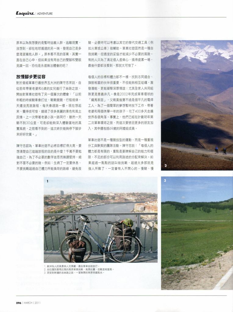 對 於曾經單車行遍世界五大洲的陳守忠來說,自從前年帶著老婆和6歲的女兒進行了絲路之旅,開始對單車壯遊有了另一個層次的體會:「以前年輕的時候騎車像打 仗,戰戰競競,行程規律,天還沒亮就啟程,每天像趕路一樣。現在想起來,覺得很可惜,錯過了很多美麗的景色和風土民情。上一次帶著老婆小孩一路同行,雖然 一天騎不到30公里,可是卻能夠深入體驗當地的真實風貌,之前看不到的,這次終於能夠停下腳步來好好欣賞。」