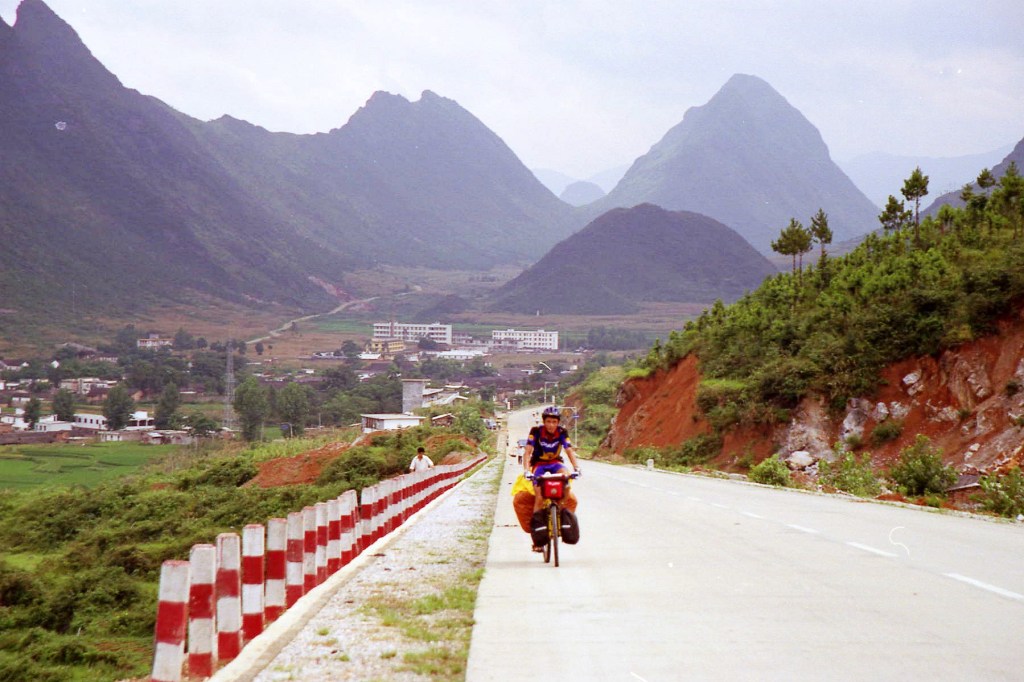 精疲力盡,埋頭騎上坡頂,原以為公路開始下坡,但遼闊的山谷間卻出現一潭綠水,眼看公路沿著湖邊山坡,往前延伸爬坡而上﹔不同於漢族建築的灰黑色瑤族山寨散落在綠色山坡上,由於地圖上沒有標示這個山中湖,所以更是不知身在何方。