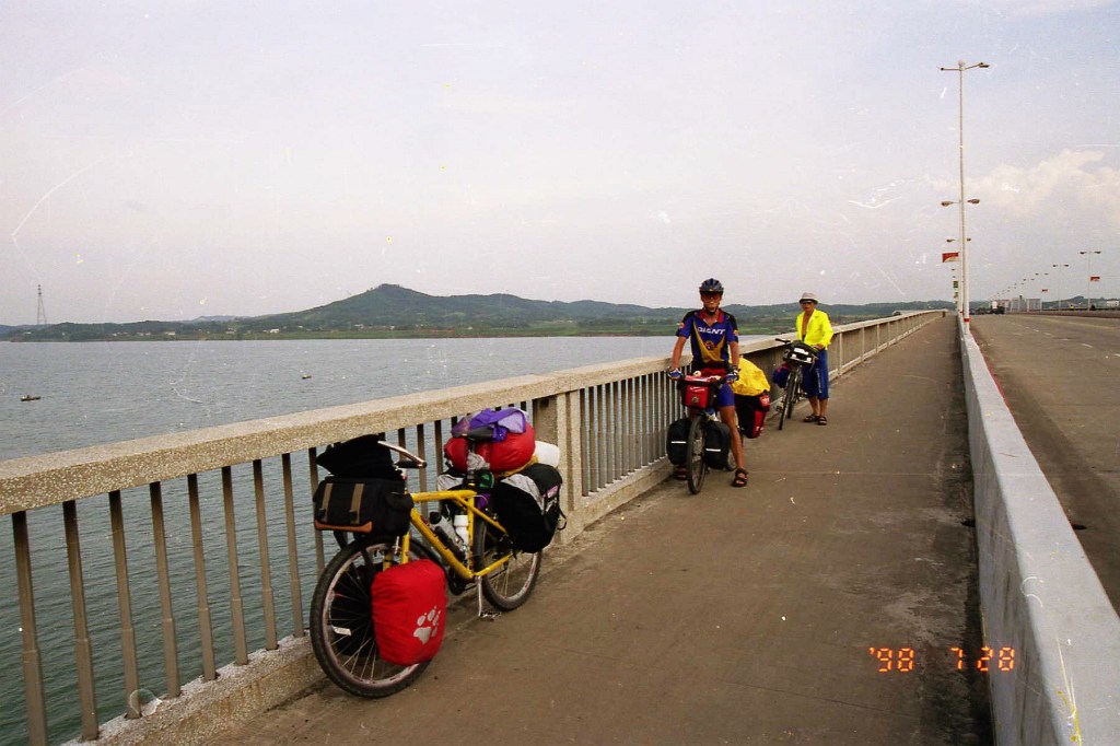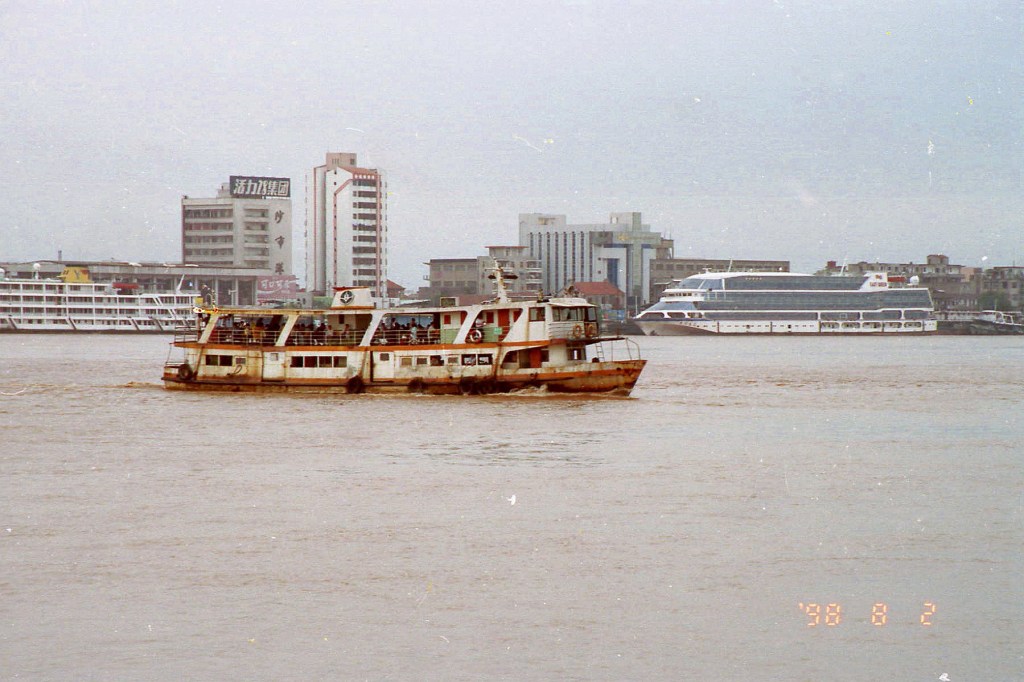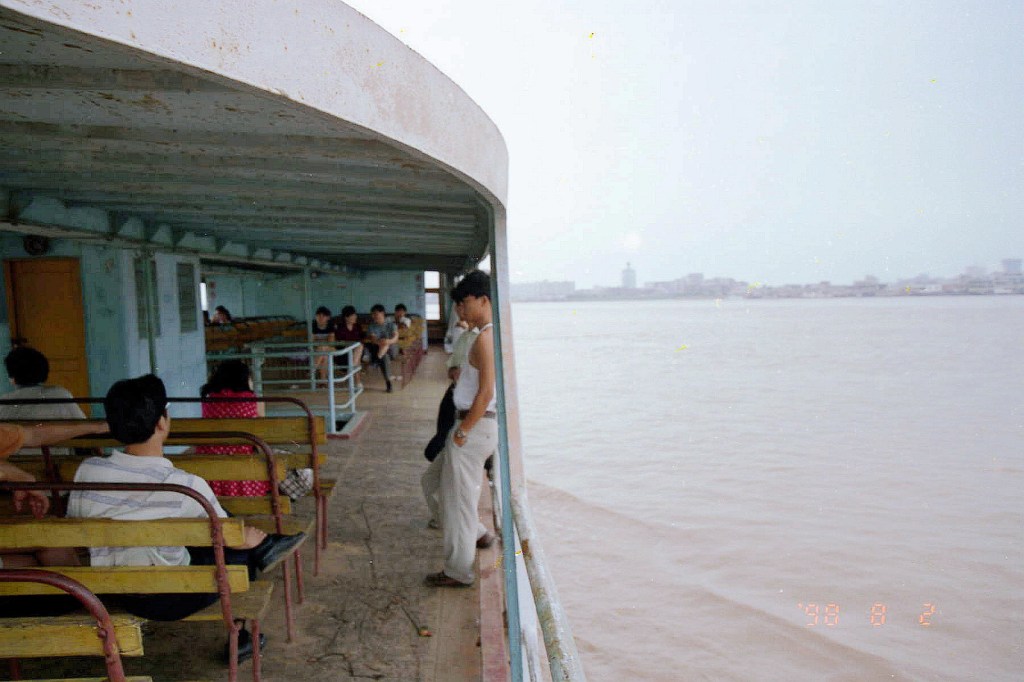 騎抵渡輪處,門口管理員招手不准我們進入碼頭,原來這區的渡輪只搭載機動車輛,行人與自行車要到隔壁的碼頭,有專載行人與自行車的小渡輪﹔人與自行車一人付了2元人民幣後,將單車推進船艙,還未停妥自行車,我們這一身行頭,可又引起船艙內的乘客騷動,立即圍繞在我們身旁,品頭論足,發表個人高見一番。當然又是許多相同的問題,有如立體聲響環繞著我們,在船艙內逃也逃不掉,只能睜大眼睛留意所有的裝備。