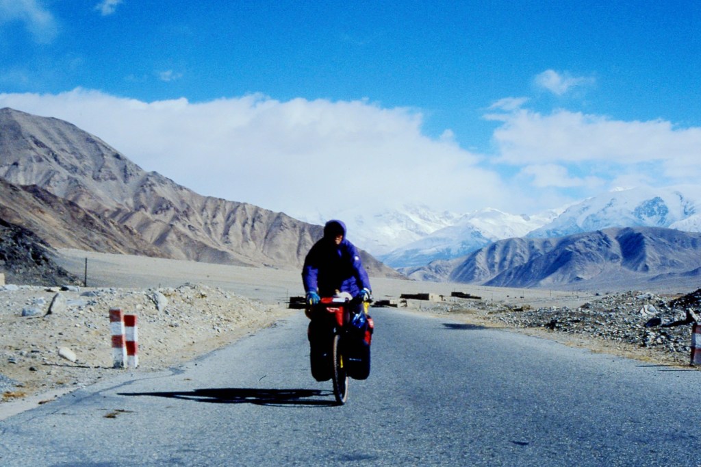 邊騎邊欣賞這大自然美景,此時路的盡頭,聳立著喀喇昆倫山脈連綿的高山雪峰,而印象中的老口岸應該是在高原谷地上,心想可能又是地圖資料錯誤,雖然今夜已有露營的準備,但能到老口岸還是比較好。頂著寒風繼續往前騎,終於在下午八點二十分天剛黑時,騎抵距麻扎15公里海拔4100公尺的老口岸。