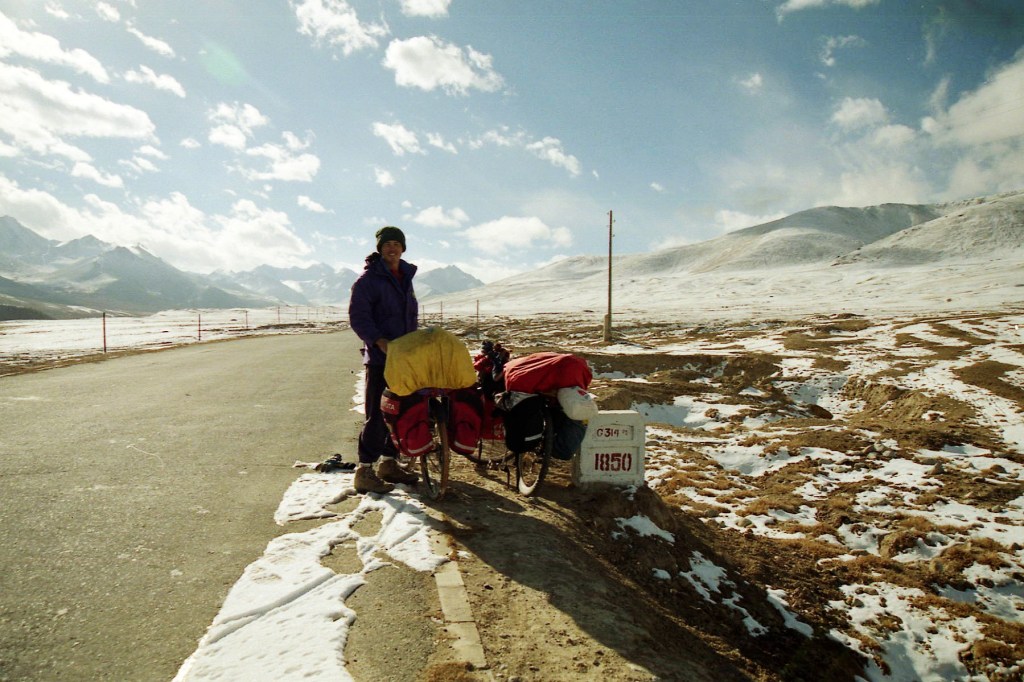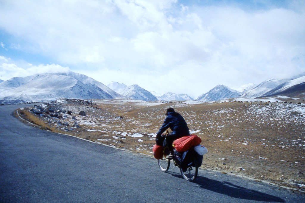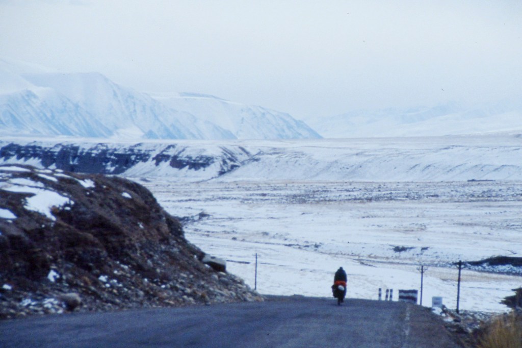 爬昇接近蘇巴什達阪,原本稍為逆風的天氣,開始變得惡劣刮起了強風,卡拉庫力湖方向早已佈滿烏雲,隔壁的山頭正飄著風雪;騎上山口,在寒風低溫中,無法多作休息,只有趕緊穿戴起手套、頭套、防風眼鏡、禦寒衣物,將全身包裹得密不通風後,跨上雪豹,離開山口。迎面吹來寒凍的風,雖是下坡,冷颼搜的感覺一點都不輕鬆,一路呼吸著冰凍的空氣,鼻子感到極不舒服,但在荒涼的高原上,根本找不到避風休息的地方,而逆風不知能否停止,天氣能否轉好,只能繼續前進。