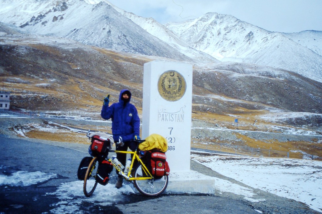 過國界碑後就有一座巴基斯坦邊防哨,嚴寒的氣溫中,兩位巴基斯坦軍人就躲在崗哨裡烤火﹔檢查護照、簽証,通過公路柵欄後,一路下坡的路況是急轉直下、之字急彎、積雪處處。騎著連續彎路飛馳的下到紅其拉甫河谷,回頭一望,高山聳立,山口、公路都在上方﹔如從巴基斯坦側,騎上山口可不輕鬆,難怪比利時圖佛斯夫婦,在這段路程中,一天只騎30公里。比較起來,還是從中國大陸緩慢爬升較為輕鬆。