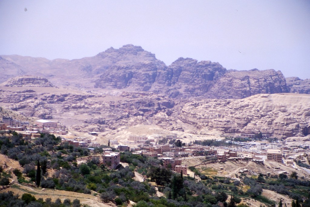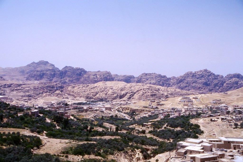 才上午11點,但氣溫已接近40度C,在高溫中暑的威脅中,鬥志早被擊敗了,決定由他送一程至佩特拉後再騎乘。上了車,公路一路爬昇到1600公尺的山口,沿途山路狹窄,一長串的大貨車緩慢無力的爬著陡坡,心裡暗自欣慰著沒有與這段荒涼炎熱的山路對決。經寬闊荒蕪的高地丘陵後,來到海拔1300多公尺的佩特拉(Petra)﹔抵達佩特拉後才知道距離阿卡巴140公里,因手中的旅遊資料與地圖並沒有詳細的距離與海拔高度,原以為佩特拉是在荒原中戈壁灘上,沒想到盡然是在一千多公尺的高原﹔這種高度落差,一天肯定騎不到,沿途也沒有投宿點,真慶幸作了搭車的決定,可知詳細資料的重要,才不會一路都不在掌握之中。