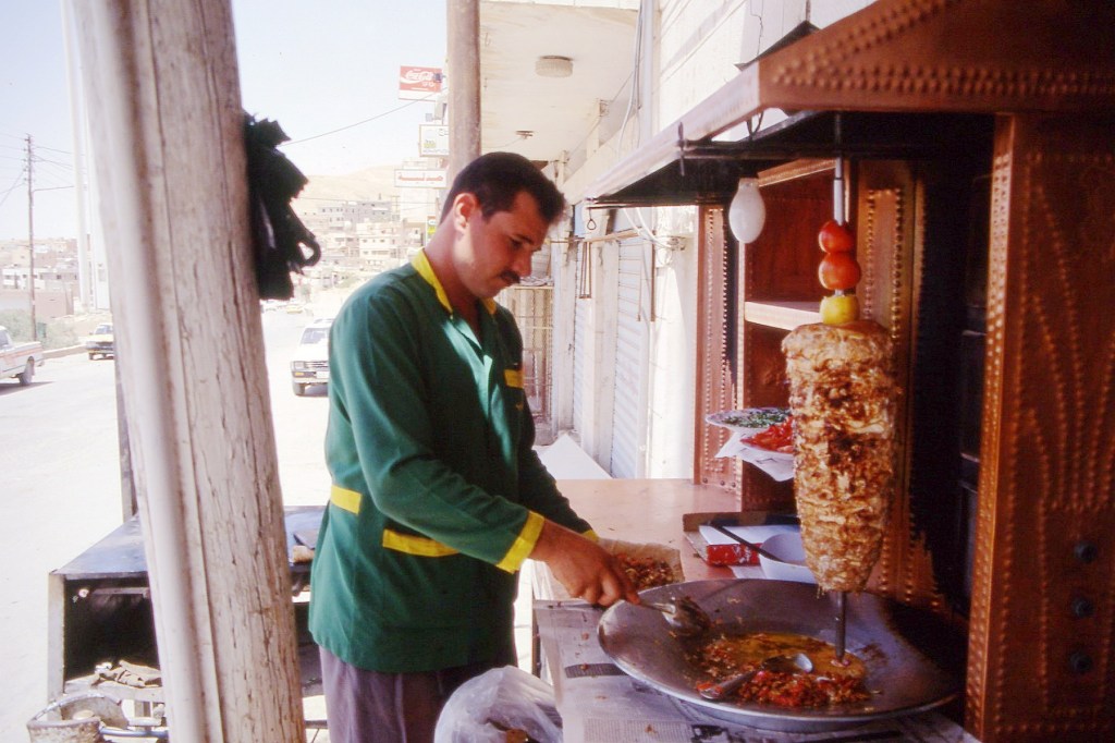 旅館周圍就有許多飲食店,最經濟實惠的食物,就在是掛著小吃店內,發熱線圈烤肉機所圍攏的一串疊著羊肉或雞肉塊的大肉串﹔削下烤熟的細肉片加上洋蔥、蕃茄、甜椒、青菜,淋上特製醬汁再捲入薄烤餅的捲肉餅,一個約人民幣5元﹔買個捲肉餅再到果汁攤喝杯檸檬、柳橙、香蕉汁。初進約旦,就感覺約旦人比埃及人和善單純,離開了處處被坑的國度,走在路上也輕鬆自在多了。