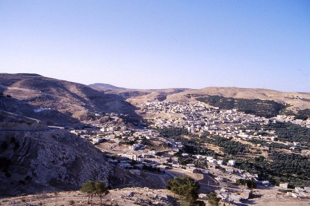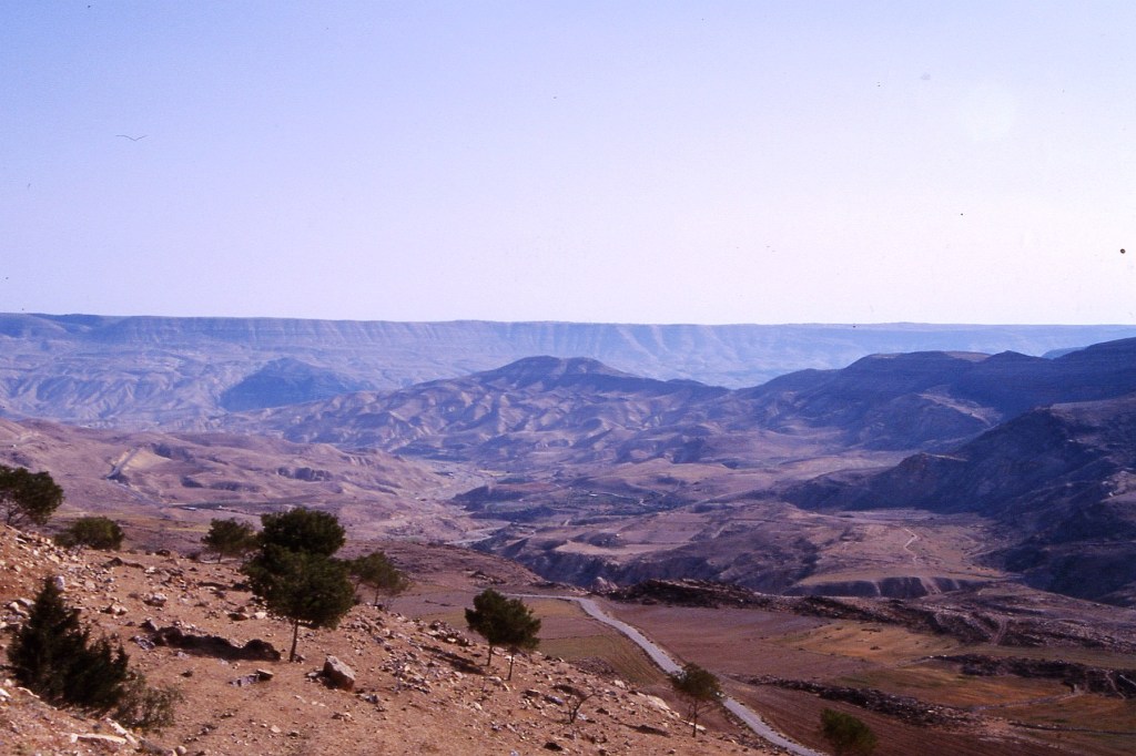 14公里的上坡路,爬昇了900公尺,再回1200公尺的高原台地﹔令人驚奇的是,眼前出現了一大片生意盎然的綠色世界,與一步之隔,宛如沒有生命的乾燥黃土Wadi山谷,有著極端的差異﹔在和風吹拂下,氣溫涼爽多了。約旦的行程中給我處處意外,與以前想像中的約旦可大不同。