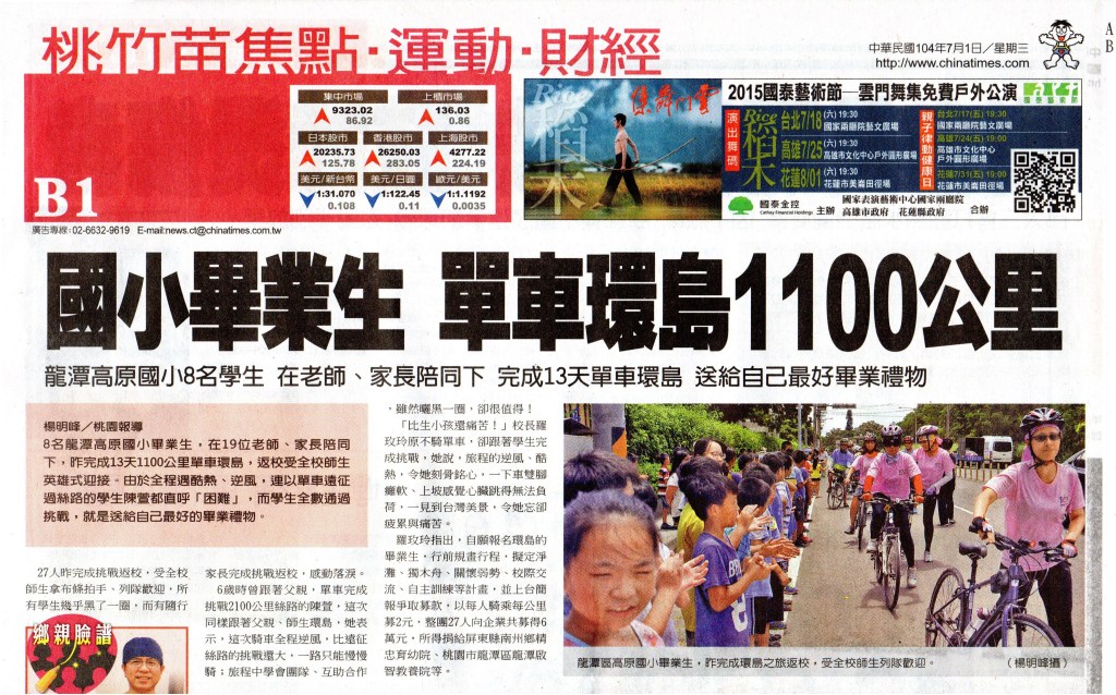 2015-07-01-中國時報- 國小畢業生單車環島1100公里: