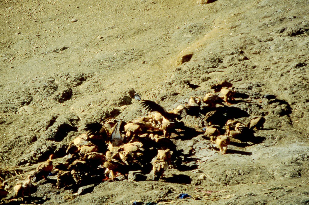 在日喀則拜訪了班禪活佛的主寺-扎什倫布寺後,徒步到位於寺院附近的天葬台,當時並沒有強制禁止遊客前往。走到位於山坡邊的天葬台,徵求了天葬師的同意後,我就坐在山坡邊,安靜地觀看整段的天葬儀式;但在最後禿鷹進食結束前,為留下這個珍貴的畫面,我按下掛在胸前的相機快門,偷偷拍了幾張照片後,就離開天葬台返回日喀則。