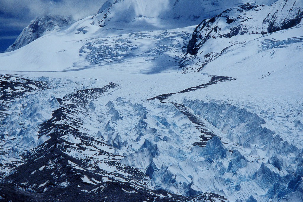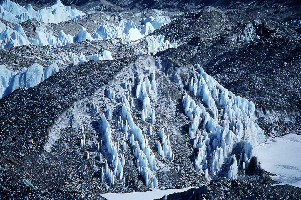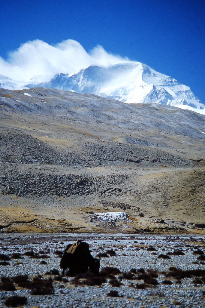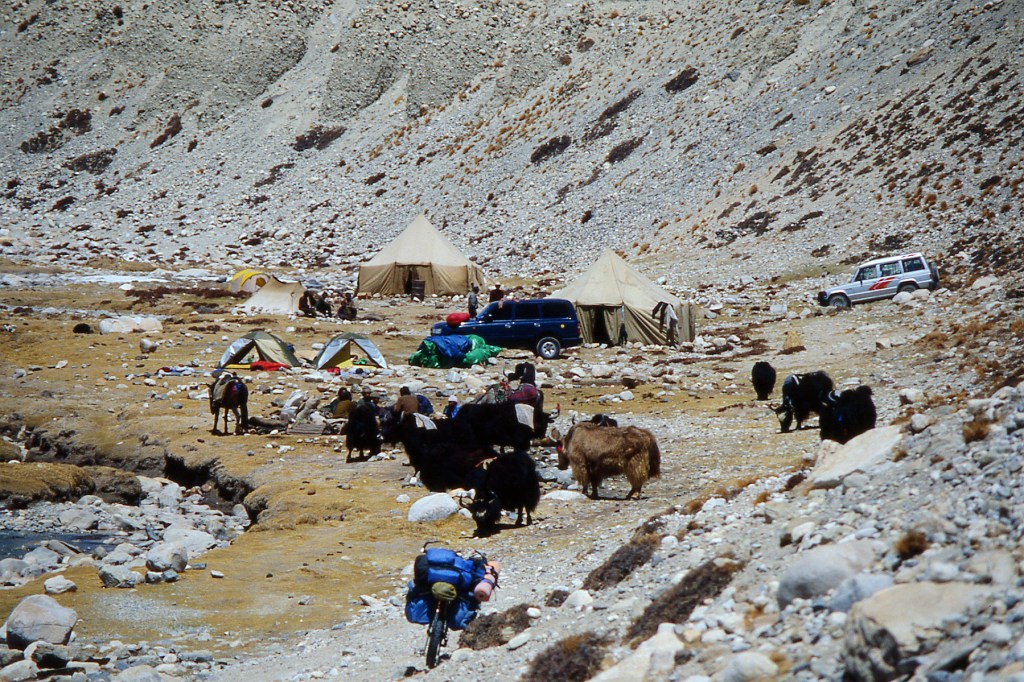 帶著帳蓬、睡袋、兩天的糧食,向留守基地營的登山協會連絡官,打聽好路程,就沿著河谷上行,往前進基地營而行。一路隨著高度的爬升,在缺氧及高海拔的因素下,步程緩慢與辛苦,沒多久,就被從後而來的犛牛隊所趕上;由於此段路況完全陌生,手中也沒地圖可參考,心裏盤算著,如跟隨著犛牛隊前進,就不怕迷路了,於是等著犛牛隊超過後,就尾隨其後而行。