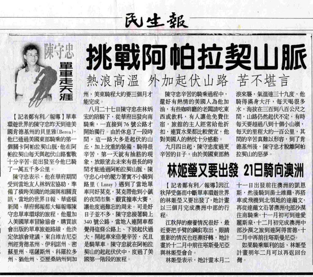 1999-09-14民生報- 挑戰阿帕拉契山脈。熱浪高溫,外加起伏山路,苦不堪言: