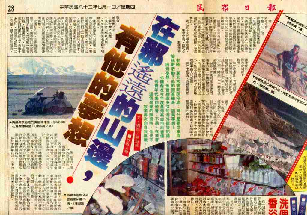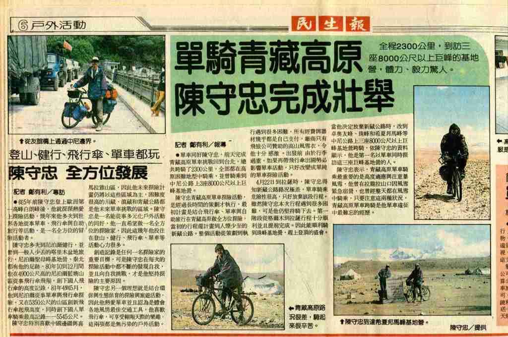 1993-06-16民生報- 單騎青藏高原,陳守忠完成壯舉。全程2300公里,到訪三座8000公尺以上巨峰的基地營,體力、毅力驚人。登山、健行、飛行傘、單車都玩,陳守忠全方位發展: