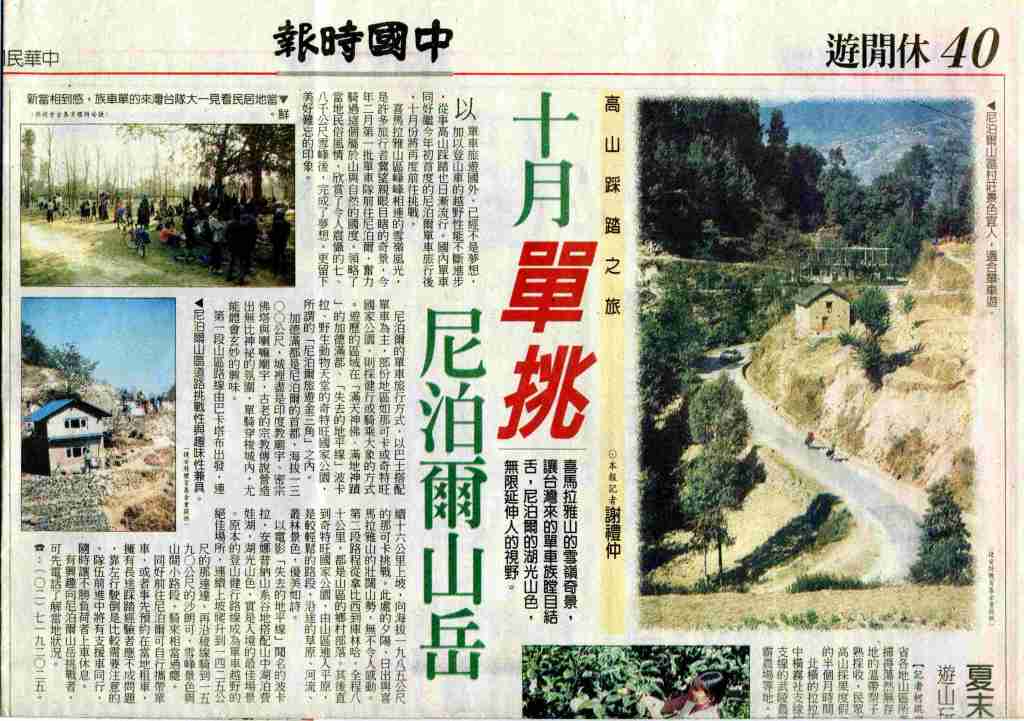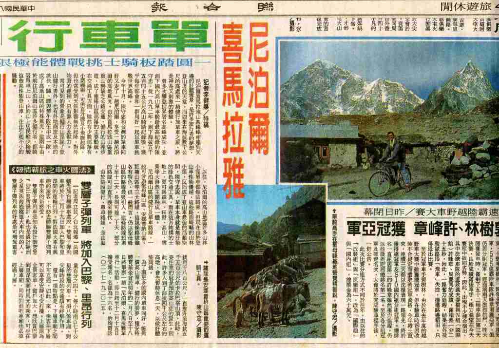 1997-08-23中國時報- 十月單挑尼泊爾山岳。喜馬拉雅山的雪嶺奇景,讓台灣來的單車族瞠目結舌,尼泊爾的湖光山色,無限延伸人的視野 :