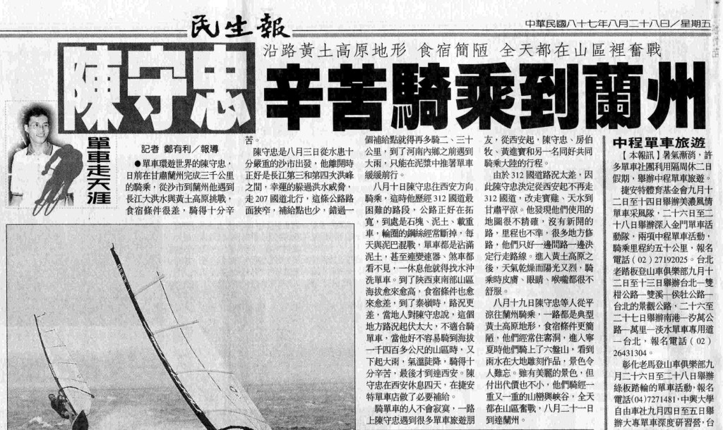 1998-08-28民生報- 陳守忠辛苦騎乘到蘭州。沿途黃土高原地形,食宿簡陋,全天都在山區理奮戰: