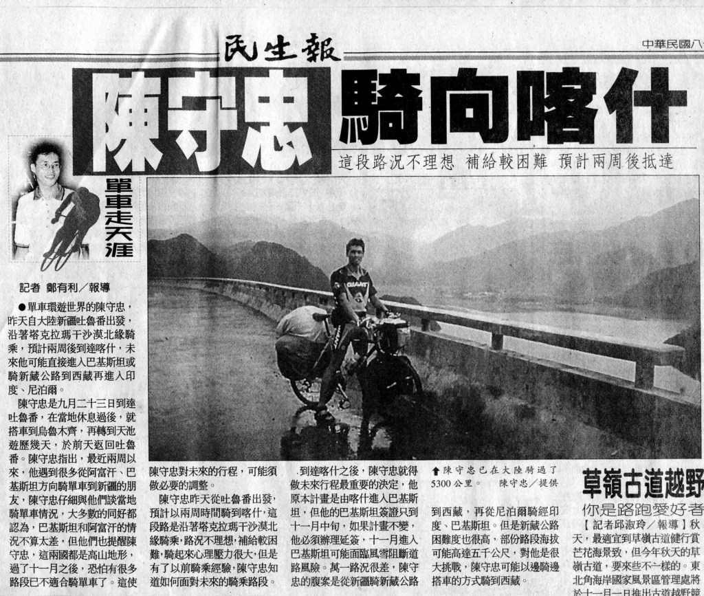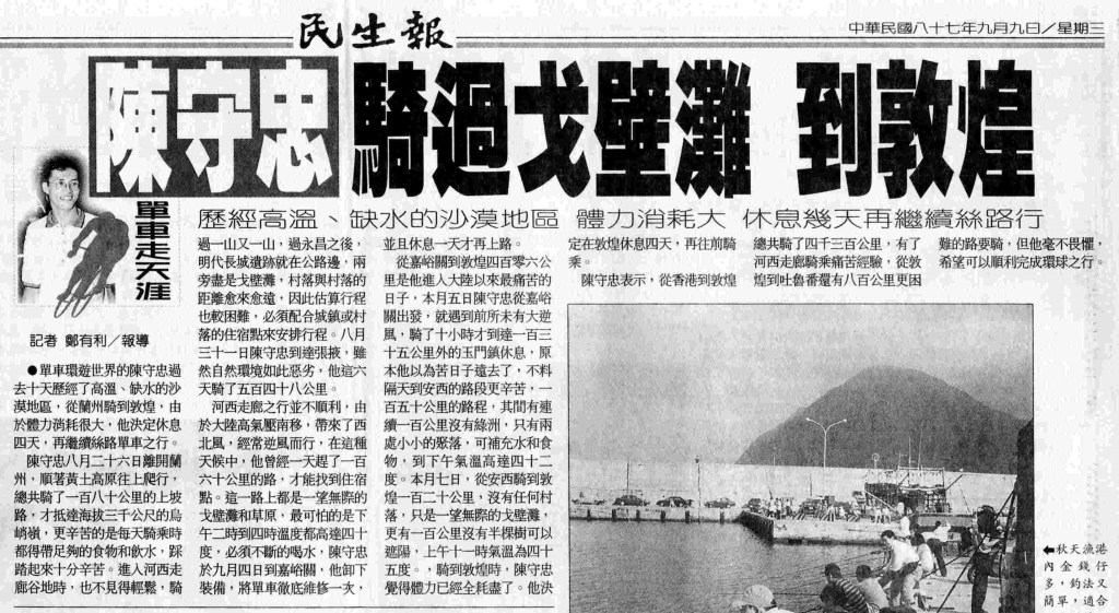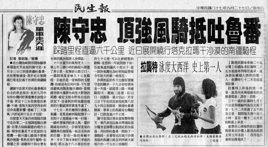 1998-09-27民生報- 陳守忠頂強風騎抵吐魯番。踩踏里程直逼六千公里,近日展開遶行塔克拉瑪干沙漠的南疆騎程: