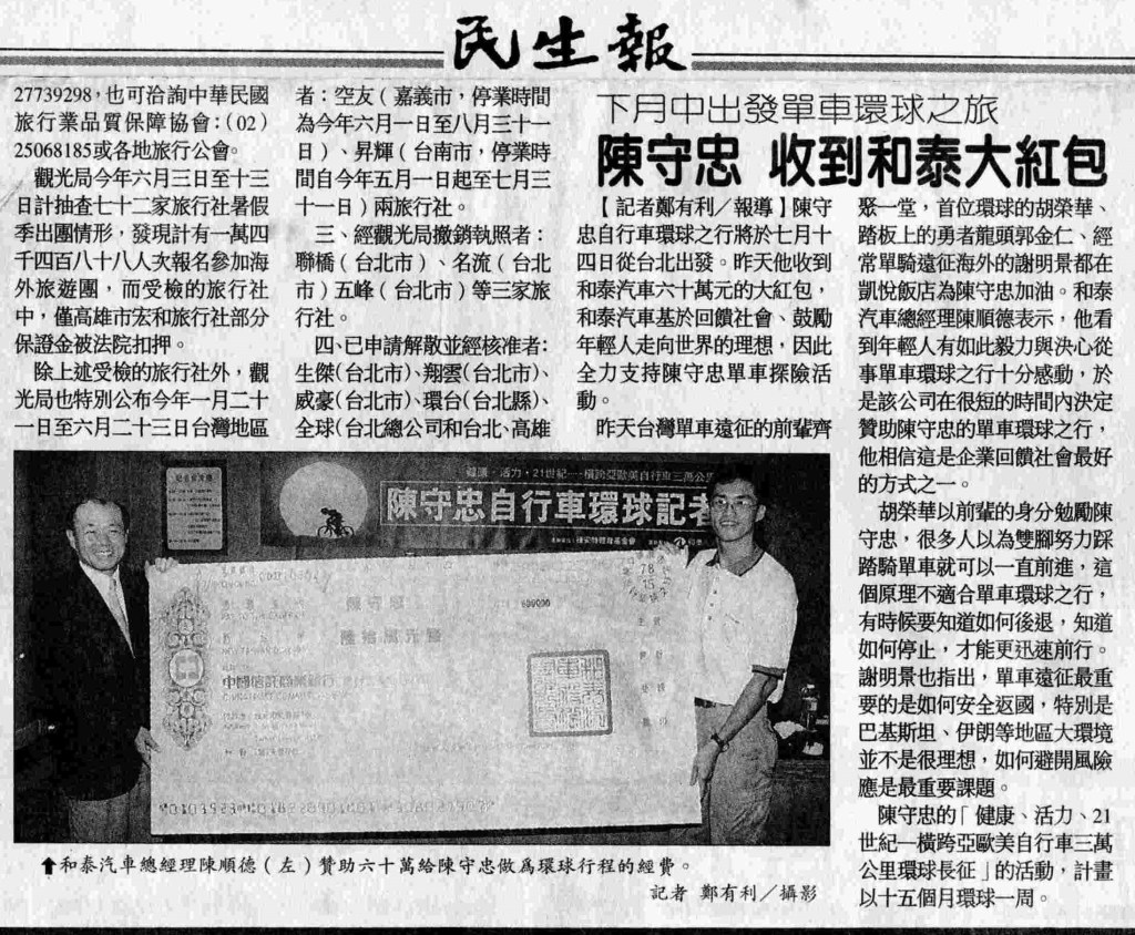 1998-06-24民生報- 下月中出發單車環球之旅,陳守忠收到和泰大紅包: