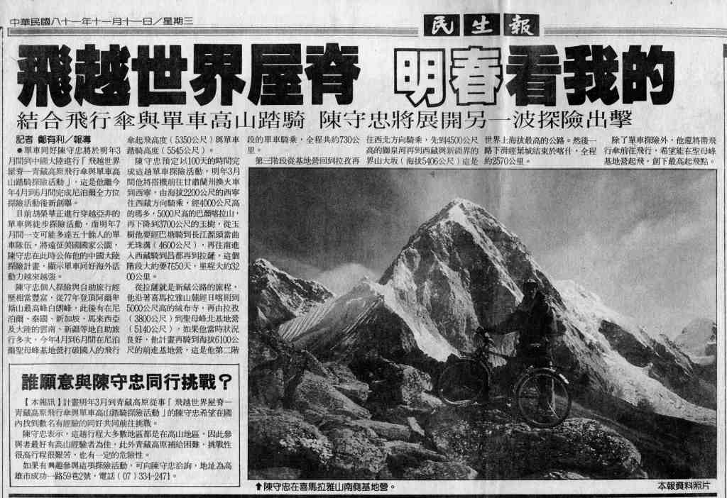 1992-11-11-民生報-飛越世界屋脊,明春看我的。結合飛行傘單車高山踏騎,陳守忠將展開另一波探險出擊: