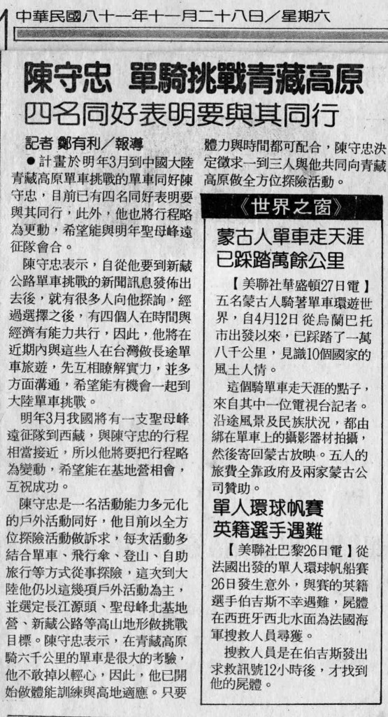 1992-11-28民生報-陳守忠單騎挑戰青藏高原,四名同好表明要與其同行: