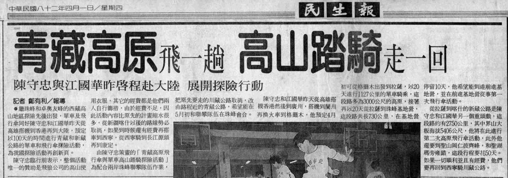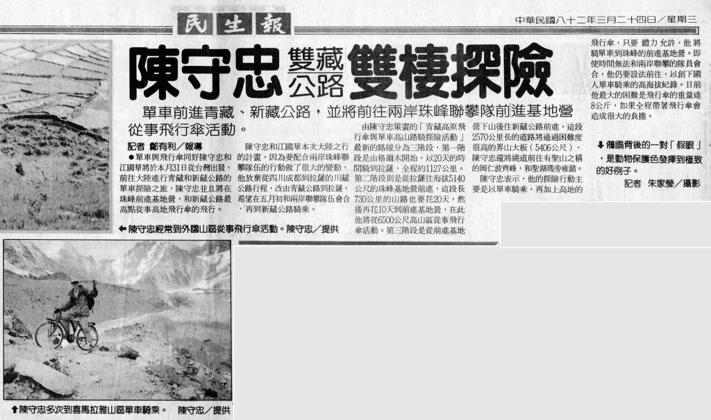 1993-03-24民生報-陳守忠雙藏公路,雙棲探險。單車前進青藏、新藏公路,並將前往兩岸珠峰聯攀隊前進基地營,從事飛行傘活動: