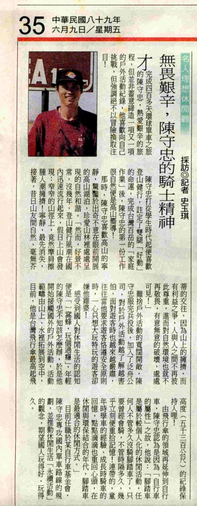 2000-06-06-自由時報- 無畏艱辛 陳守忠的騎士精神: