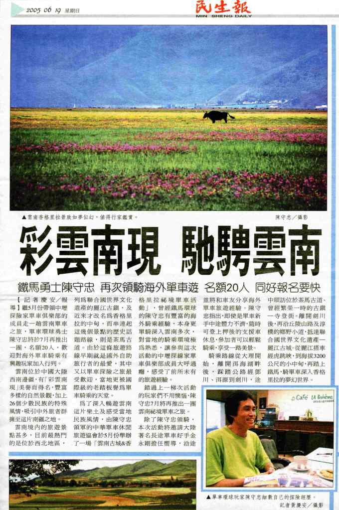 2005-06-19-民生報- 彩雲南現 馳騁雲南。鐵馬勇士陳守忠,再次領騎海外單車遊,名額20人,同好報名要快: