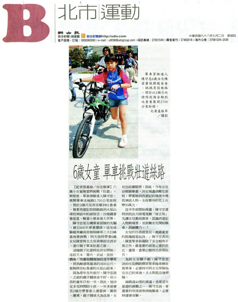 2009-07-02-聯合報- 6歲女童 單車挑戰壯遊絲路: