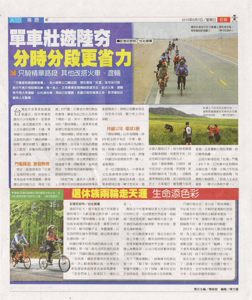 2015-06-07-旺報-單車壯遊陸夯 分時分段更省力 只騎精華路段 其他改搭火車: