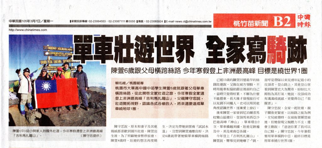 2016-03-07-中國時報- 單車壯遊世界 全家寫「騎跡」: