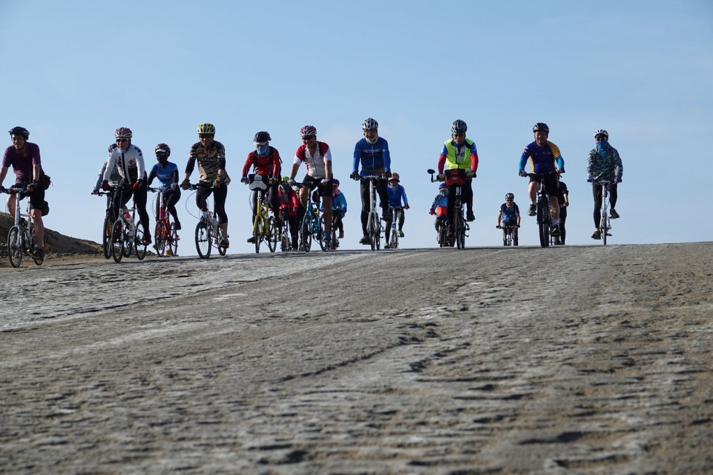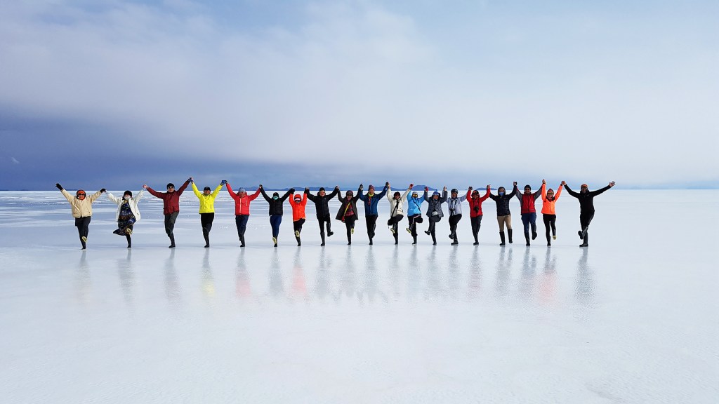 經分段點玻利維亞首都拉巴斯後,抵達第2段行程的重點有天空之鏡之稱,面積為台灣三分之一的世界最大鹽沼烏尤尼。團隊也在大雪紛飛之後,搭配著整片的白色鹽地,在天蒼蒼、地茫茫的遼闊空寂中,體驗鹽沼上的騎行,也是第一支在烏尤尼鹽沼騎行的亞洲單車大型團隊。