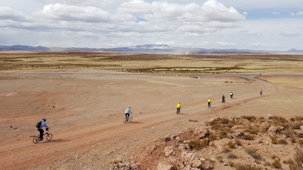 從烏尤尼穿越玻利維亞西部安地斯高原地區,探訪不同顏色的高原湖湖泊,再翻越此行中的最高處,海拔4908公尺的Sol de Mañana噴泉地區,體驗路況積雪又鬆滑,加上缺氧的高海拔騎行後,進入智利。再一路南下穿過乾燥荒涼的阿塔卡馬沙漠,抵達智利首都聖地牙哥。