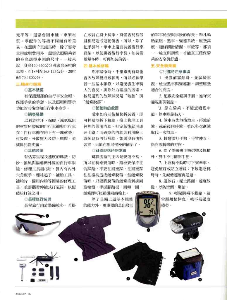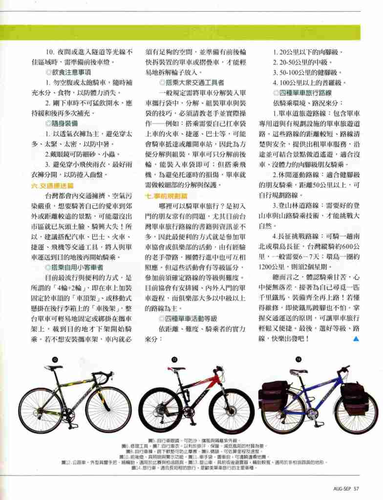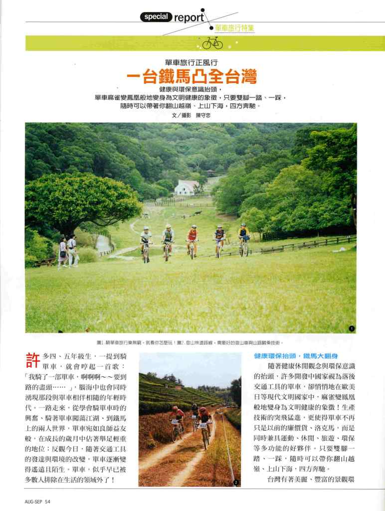 台灣美麗豐富的景觀環境,許多地區原本就適合單車旅行,近來因週休二日與台東關山環鎮自行車道成為旅遊熱門景點的成功案例,許多縣市政府也開始規劃設置單車旅行道,提供民眾一些戶外休閒旅行的好去處,因此本期也特別介紹如何從事單車旅行與全台一些經典的路線,大伙一起追隨單車旅行休閒風的流行趨勢,來去騎車。