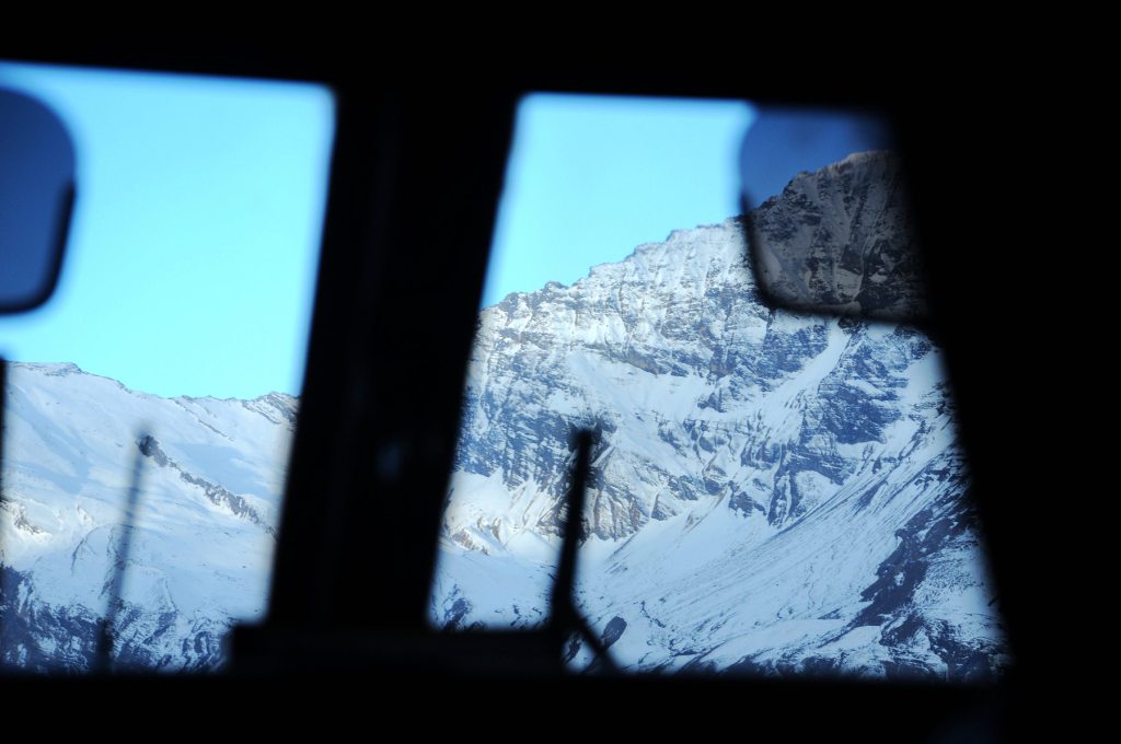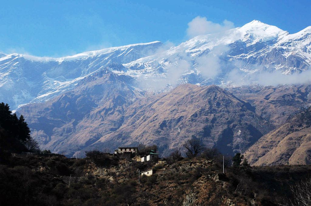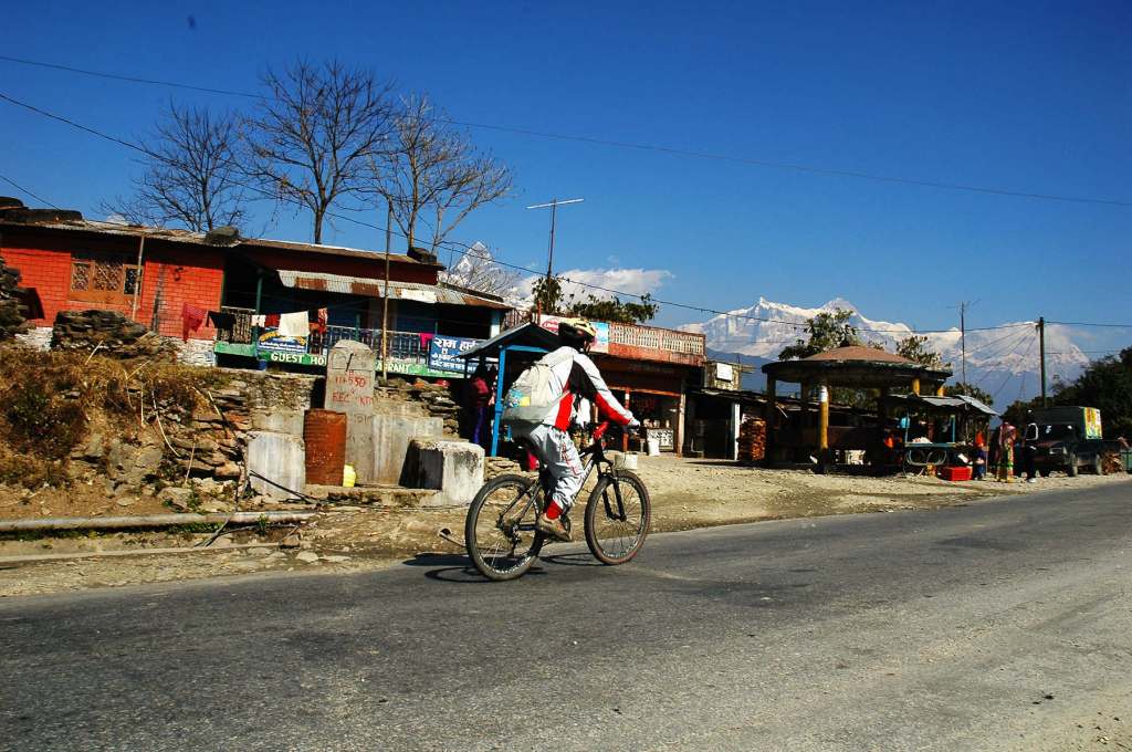 開始環安娜普納健行路線行程,沿著卡利甘達基河谷(Kali Gandaki)的泥石土路(Off-Road)騎行上溯,經有溫泉的Tatopani和一些河谷山村,抵達被幾座雪山環抱的Kalapani。包括世界第七高峰道拉吉里峰(8,167公尺)、尼爾吉里雪山(7,061公尺)。