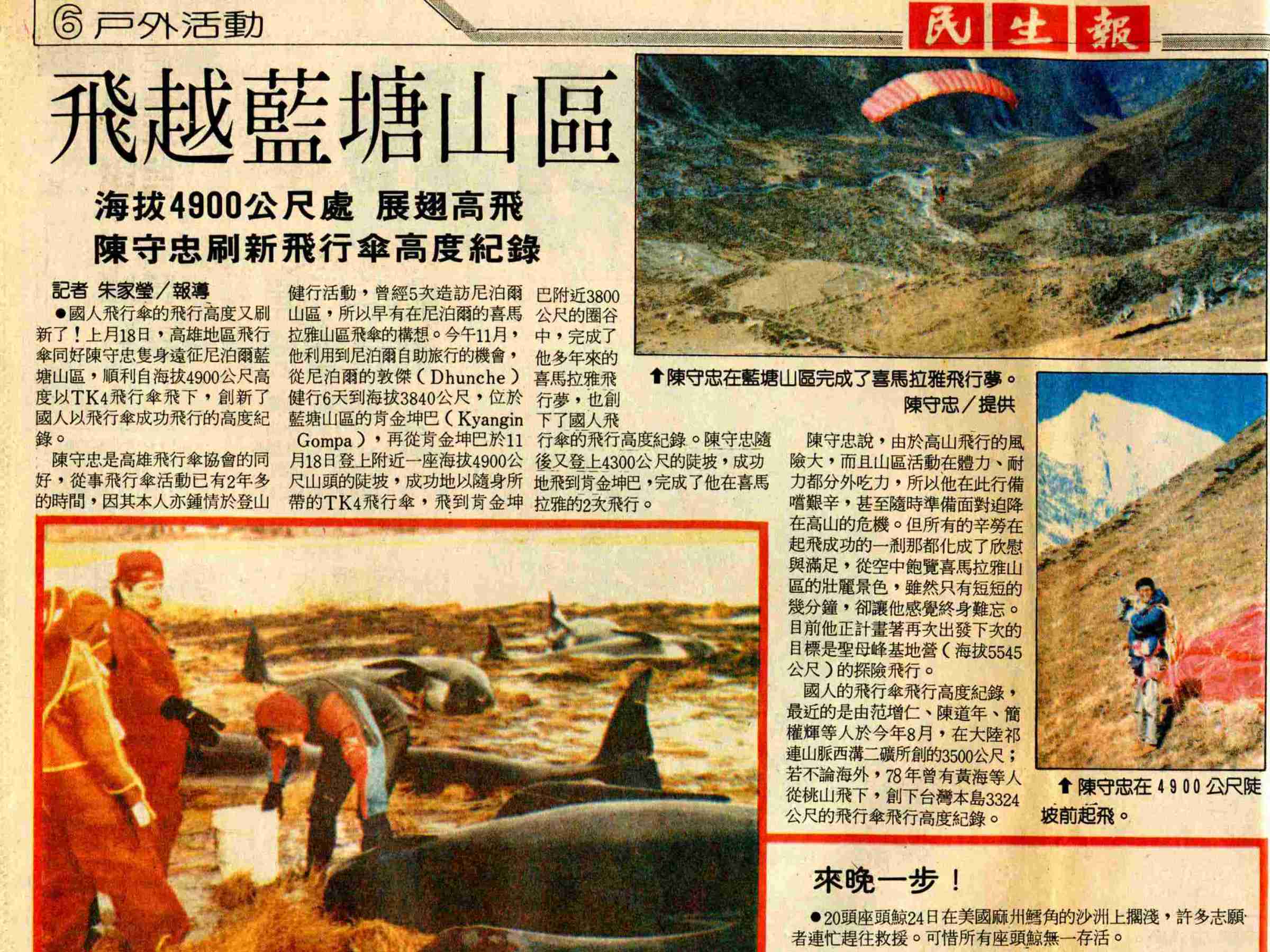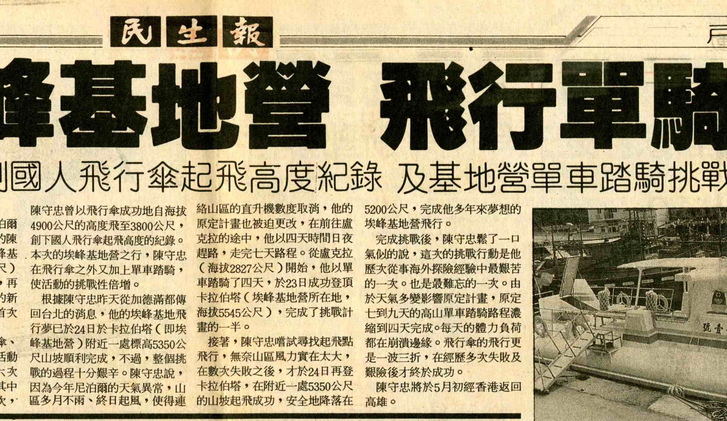 1992年4~5月尼泊爾聖母峰南側基地營自行車高山踏騎記錄(5545公尺)。並再次打破飛行傘起飛高度記錄(5350公尺)。