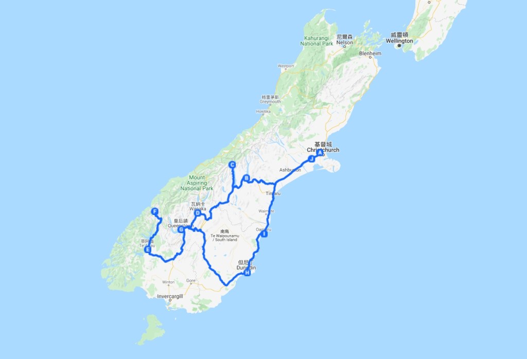 第1段的南島行程,從南島最大的城市基督城出發,繞行一圈後,再返回基督城。行程重點探訪: