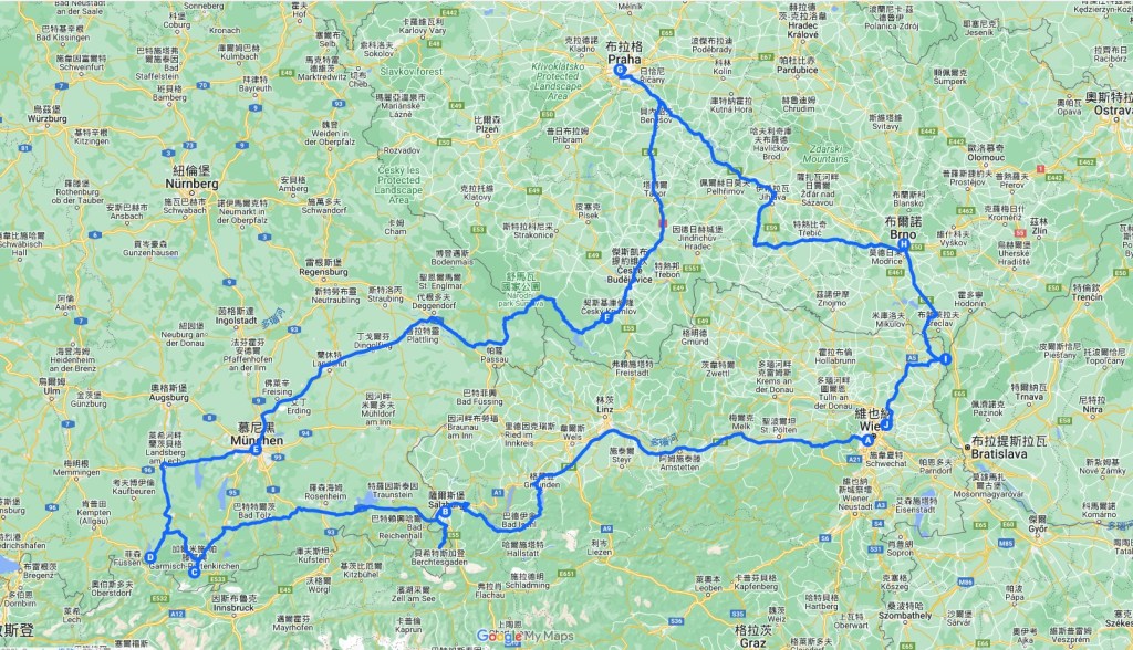 行程安排探訪世界遺產-多瑙河瓦豪地區;世界上最美麗小鎮的哈斯塔特;真善美電影場的景聖沃夫岡湖區;音樂神童莫札特的故鄉-薩爾斯堡;德奧交界地區的國王湖;有雙子城之稱的加米許‧帕騰希爾基和德國最高山楚格峰;巴伐利亞草原奇蹟的世界遺產-威斯教堂;全歐洲最漂亮的城堡,由路德維二世國王所建的三座宮殿之一的新天鵝堡;沿著羅曼蒂克大道路線北行,抵達巴伐利亞首府也是德國南部第一大城的慕尼黑;穿越的德國及捷克國界後,抵達被稱為捷克最優美城鎮的世界遺產-契斯基庫倫洛夫;波希米亞地區的巴洛克式建築的村莊,世界遺產-霍拉舍維采;世界最美的城市之一,有百塔之城之稱的捷克首都-布拉格;夢幻景緻的粉彩色建築小鎮-泰爾奇;摩拉維亞王國首都,也是捷克第二大城市的布爾諾;歐洲最大的人工風景區之一的世界遺產-萊德尼采;捷克、奧地利和斯洛伐克3國交界點;再返回奧地利首都也是世界遺產的維也納,結束此次中歐段的單車壯遊騎程。
