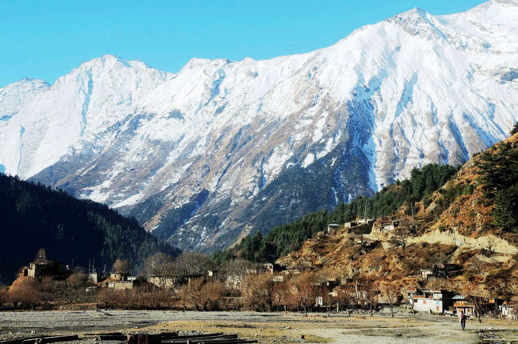開始環安娜普納健行路線行程,沿著卡利甘達基河谷(Kali Gandaki)的泥石土路(Off-Road)騎行上溯,經有溫泉的Tatopani和一些河谷山村,抵達被幾座雪山環抱的Kalapani。包括世界第七高峰道拉吉里峰(8,167公尺)、尼爾吉里雪山(7,061公尺)。