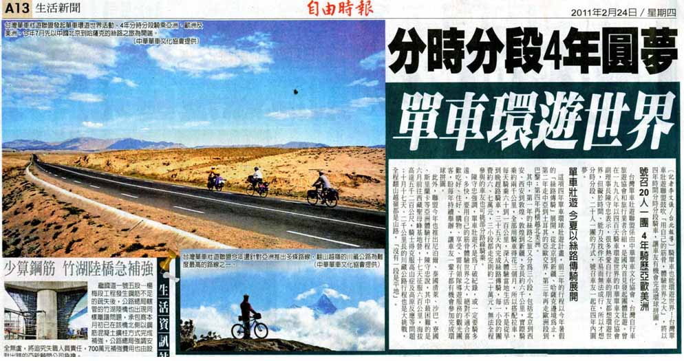 自由時報2011/02/24 〔記者李文儀/台北報導〕騎單車也能環遊世界!台灣單車壯遊聯… Continue Reading “媒體報導 | 自由時報 – 單車環遊世界 分時分段4年圓夢"